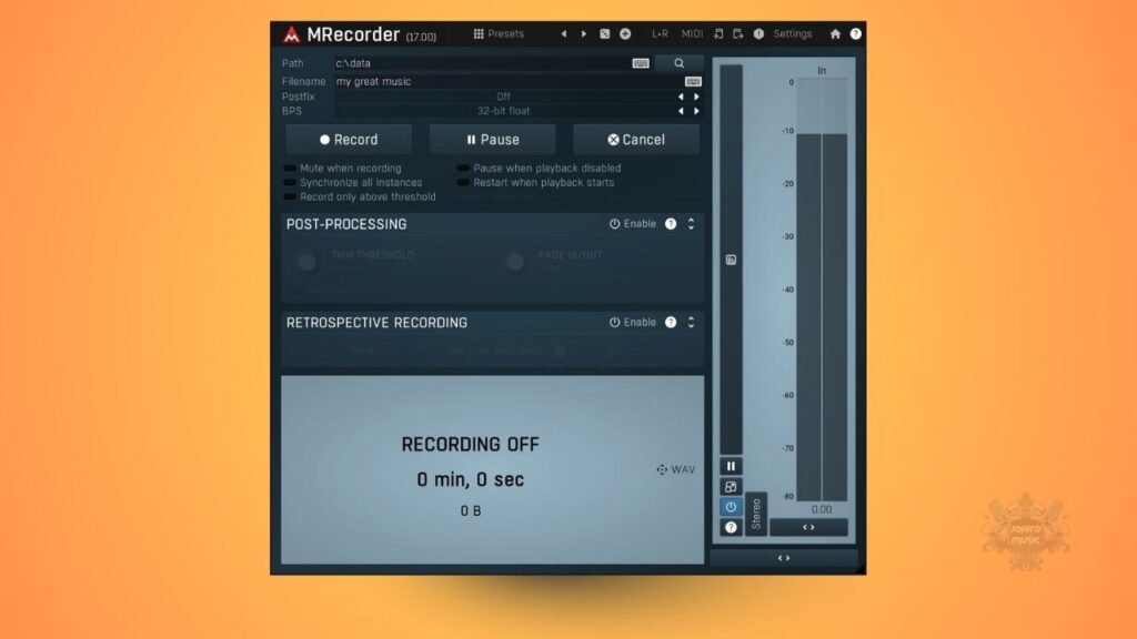 MRecorder is a straightforward utility plugin from MeldaProduction that records the incoming signal directly to a WAV file inside your DAW. Ideal for printing stems, capturing processed audio or archiving test passes, it supports mono, stereo, M/S, surround.