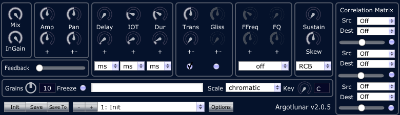 Argotlunar is an innovative real-time delay-line granulator designed to transform incoming audio into surreal soundscapes. By breaking an audio stream into short grains, each customizable with parameters like amplitude, panning, duration, delay, pitch, glissando, filter, and envelope, Argotlunar opens up a world of creative audio manipulation. These grains are mixed and sent to the main output, which can be fed back into the input for chaotic and textured layering.