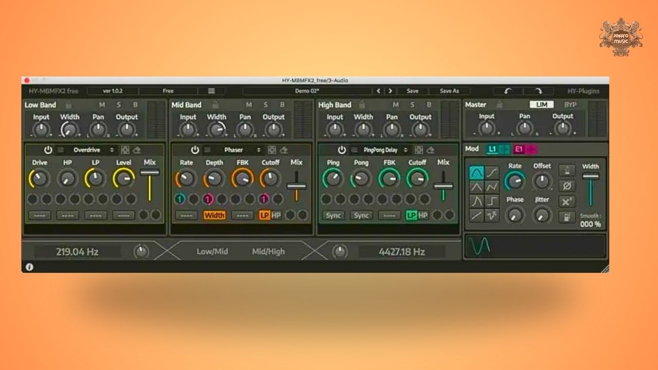 HY-MBMFX splits your audio into Low, Mid, and High bands, with adjustable crossover points. Each band is processed separately, which makes it ideal for multiband delay tricks, widening only the top-end, or keeping sub energy stable while you get experimental up top.
