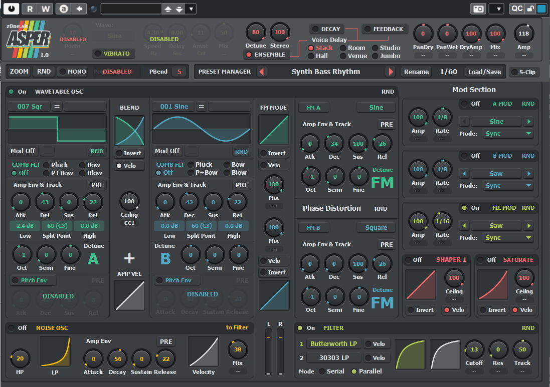 Asper’s filter section can operate in serial or parallel modes, with additional modulation controls for cutoff behaviour and response shape.